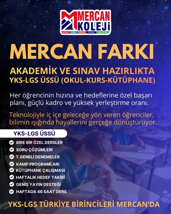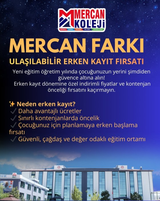 Mercan Koleji Eğitim sektöründe çeyrek asrı aşan tecrübesiyle kurulduğu günden bu yana gelişimi ve başarıyı kendine ilke edinen Mercan Koleji dünya vatandaşı başarılı nesiller yetiştirtiriyor. Ulusal ve uluslararası bilimsel, kültürel, sanatsal, sportif yarışmalarda, lise ve üniversite giriş sınavlarında göstermiş olduğu başarılarla ülkemizde örnek gösterilen bir kurum olmanın haklı gururunu yaşıyor.Mercan Koleji Malatya Kampüsü EN İYİ Anaokulu, İlkokul, Ortaokul, Fen Lisesi, Anadolu lisesi